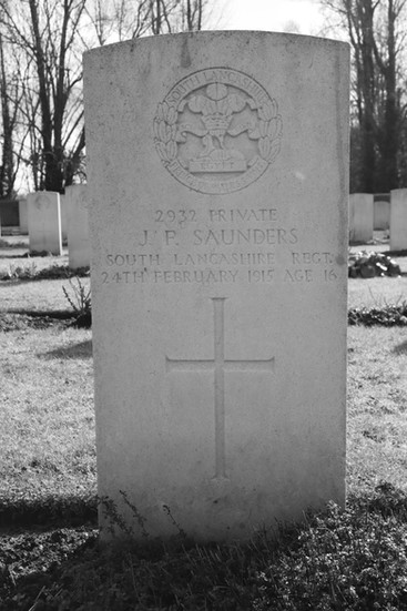 2192 Private Arthur William Day, 2nd Battalion Monmouthshire Regiment, 12th Infantry Brigade, 4th Division. Killed in action 3 February 1915, age 16. Grave I.F.10. Son of William. H. and Elizabeth Ann Day, Cwrdy Cottage, Griffiths Town, Newport, Monmouth. The Battalion was in the line at Le Touquet and holding the line here and the second line at ‘Seven Trees’. They were working on improving their trenches. The War Diary records casualties for the period 1 to 14 February as 4 killed and 6 wounded. 2932 Rifleman John Francis (Frank) Saunders, 5th Battalion South Lancashire Regiment, 12th Infantry Brigade, 4th Division. Killed in action 24 February 1915, age 16. Grave I.H.6. Son of John Thomas and Sarah Alice Saunders, 26 Grafton Street, St. Helens, Lancs. The Battalion moved up from Le Havre on 14 February and went into the trenches at Le Touquet with their HQ in Le Bizet on 16 February. Here ‘C’ Company underwent trench instruction attached to the Lancashire Fusiliers and ‘A’ and ‘B’ Company attached to the 2nd Monmouthshire Regiment. ‘D’ Company went into the line for instruction on 26 February. On the 24 February the War Diary recorded ‘1 Rifleman killed and 2 wounded.’ 2130 Private Harry Shaw, 2nd Battalion Monmouthshire Regiment, 12th Infantry Brigade, 4th Division. Killed in action 12 March 1915, age 16. Grave I.J.3. Son of W. Henry and Blanche Shaw, 23 Avon Road, Blaenavon, Monmouth. The Battalion was in the trenches at Le Touquet. They rotated in and out of the front line. Casualties for the period 1 to 15 March were recorded as 1 Officer killed and 1 wounded. Other Ranks 3 killed and 21 wounded.
