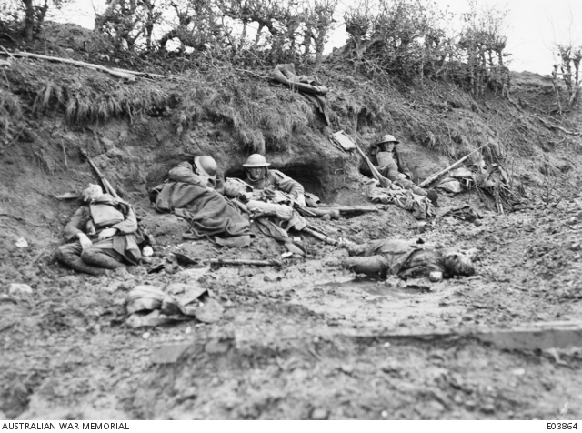 The images show dead and wounded Australians from the 3rd Australian Division on 11 October 1917 taking shelter in the railway cutting, and dead Germans in the railway cutting near to Daring Crossing. The second image shows the location today.