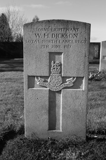 They were part of the attack on the opening day of the Battle of Messines. On the 7 June 1917, the Battle of Messines began with nineteen large mines being blown beneath the German strong points from Ploegsteert to St Eloi followed by a heavy barrage and infantry assault. The attack was a complete success with the Messines Ridge being taken. During this opening action the Battalion was holding the line south of the River Warnave. The Battalion sector was heavily shelled by 5.9 inch guns and shrapnel by the Germans with the War Diary recording that one officer and two other ranks killed, and 7 other ranks wounded with three other ranks sick. 2nd Lieutenant William Herbert Dickson, 2nd/4th Battalion The Loyal North Lancashire Regiment, 170th Infantry Brigade, 57th Division. Killed in action 7 June 1917. Grave A.1. Son of George and Mary Dickson. His father was a solicitor and William followed him into that profession before he was commissioned. His brother, Captain. Arthur Norman Dickson, M.C., Indian Medical Service, was a Medical Officer with the Indian Army with his service in India. He retired in 1934. His MC was gazetted on 1 June 1917 in the King’s Birthday Honours for meritorious service rather than for a specific act of gallantry. 200829 Private Richard Miller, ‘B’ Company, 2nd/4th Battalion The Loyal North Lancashire Regiment, 170th Infantry Brigade, 57th Division. Killed in action 7 June 1917, age 25. Grave A.2. He was married to Lottie and they lived at 68, Ribble Bank Street, Preston. They had no children. He was employed as a spinner when he enlisted on 16 October 1914 as a Territorial. The Army returned his possessions to his widow they consisted of 1 identity disc, this would have been of his own design, 1 AB50 small book which contained his personal details, notes and observations designed to help the soldier, letters, photographs, 1 watch (glass broken) and chain. 202259 Private John James Sharkey, 2nd/4th Battalion The Loyal North Lancashire Regiment, 170th Infantry Brigade, 57th Division. Killed in action 7 June 1917, age 34. Grave A.3. Son of Mary Sharkey, 17 Birley Street, Astley Bridge, Bolton. His epitaph reads PASSED FROM THE SHELL SWEPT FIELDS OF FRANCE TO THE CALM AND PEACE OF PARADISE.