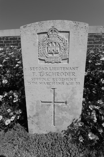 There are eighteen men from the 2nd Battalion Suffolks buried here. I have selected three men killed in March 1915. Second Lieutenant Francis Thomas Schroder. Killed in action 15 March 1915, age 22. Grave B.6. Son of Henry and Minnie Schroder, Hackney, London. One of the first casualties from the Suffolks to be buried here. Educated at the Royal Hospital School at Holbrook he was serving as a Sergeant in the Grenadier Guards when he received his commission and joined the 2nd Battalion in early 1915 in the Salient. The Battalion was in the line in front of Wytschaete. The CWGC records show that he was killed on 15 March this is based on the Graves Registration Report Form however, the Battalion War Diary for 24 March records that’ 2Lt F T Schroder killed, 10 men wounded. A rifle grenade landed in L5 doing most of the damage.’ 3/10240 Sergeant Thomas Rush. Killed in action 20 March 1915, age 40. Grave B.8. Husband of Anna Elizabeth Rush, 33 Trevor Road, Wimbledon, London. The Battalion was in the line at Petit Bois the War Diary records on the 20 March: ‘Sgt T Rush 10240 – Pte H Tricker 15236 killed one man wounded.’ Private Henry Thomas Tricker is buried in Grave B.7. 12816 Private David George William Page. Killed in action 29 March, age 31. Grave B.5. Son of David and Sarah Ann Page, Sheppard's Lane, Holbrook, Ipswich. He was working as a Farm Labourer when he enlisted and landed in France on 27 December 1914 and joined the 2nd Battalion. On the 29 March the Battalion was in the line in front of Wytschaete. The War Diary recorded: ‘Pt H Page 12186 killed 8 men wounded.’